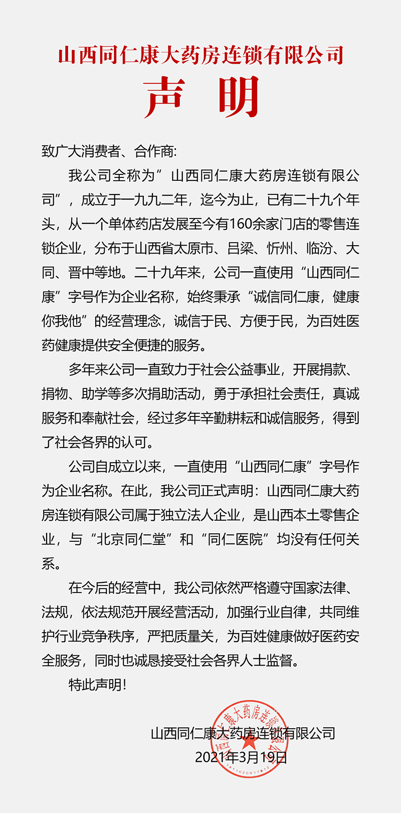 山西同仁康大藥房連鎖有限公司聲明